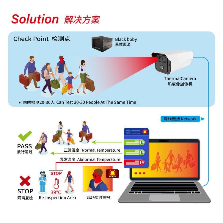 This Intelligent AI binocular thermal imaging system is composed of AI binocular temperature detecting camera and AI thermal imaging screening system.Integrated by thermal temperature detecting sensor of high-accuracy, built-in intelligent face capture algorithm, and ISP image signal processing technology etc, this device is with face detection, temperature detection and face capture, etc powerful features. With AI thermal imaging screening system, it can accurately detecting the body temperature, capturing face picture and records for those people appeared in front of this device. It can effectively help to monitor and detect the body temperature of entry and exit people, thus contributing to prevent epidemic situation. It can be widely used at all kinds of entrances and exits of school, buildings, stations, etc.